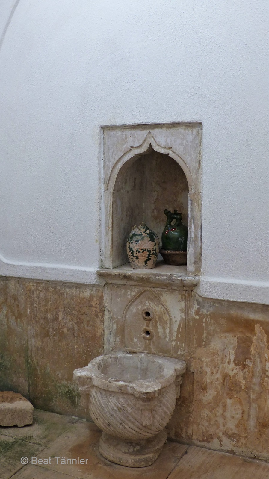 Wir bewundern die vielen schönen Details in und an dem Gebäude während monoton-meditativer Singsang erklingt. In einem Gebetsraum rufen einige Frauen und Männer auf diese Weise Gott an.