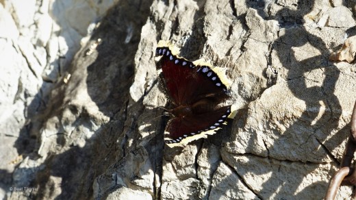 Auch die Insekten geniessen den heissen (wieder über 30° C) Tag. Ein Trauermantel versucht mit geöffneten Flügeln so viel Wärme zu tanken wie möglich.