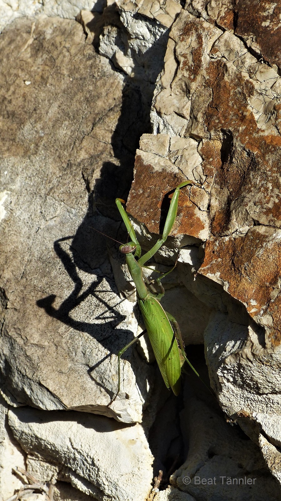 Gleich daneben wirft eine Gottesanbeterin ihren Schatten auf den Fels.
