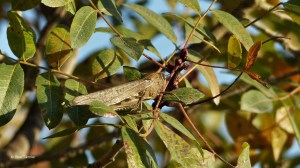 Annette entdeckt eine Heuschrecke, die nach dem Motto : „Gell, du siehst mich nicht!“ bewegungslos auf den Blättern steht.