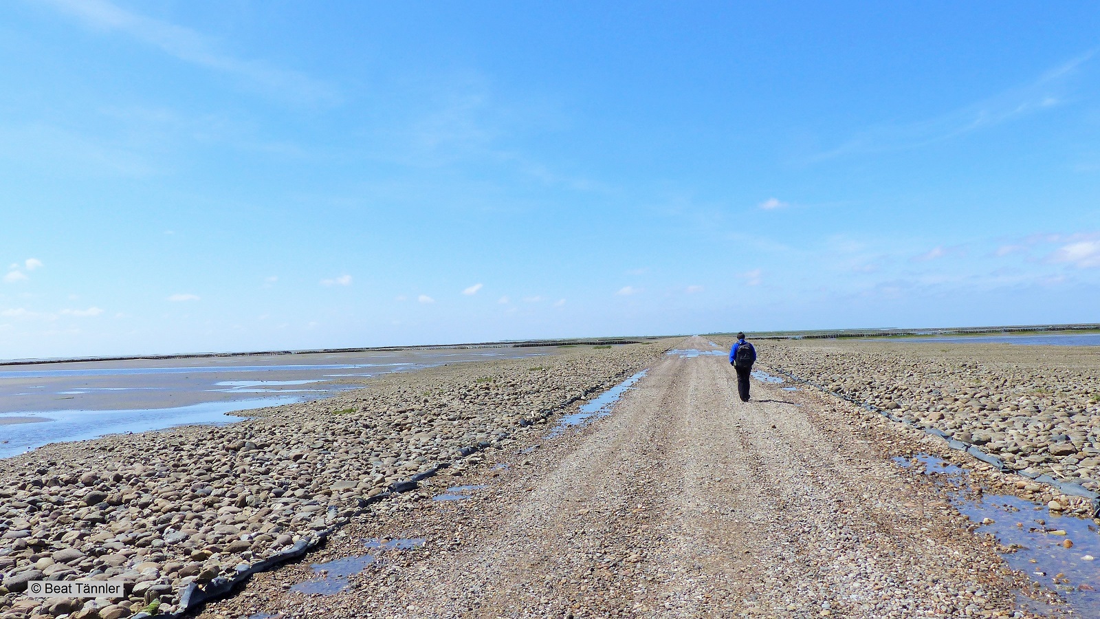 Da wir Inselfans sind, wollten wir nun Mandø besuchen. Die Insel ist durch einen schmalen Weg mit dem Festland verbunden. Diesen sollte man aber nur bei Niedrigwasser befahren, wie uns eine Tafel am Wegrand warnte. Wir standen drei Stunden vor Hochwasser auf dem niedrigen Damm und fanden, dass wir eine Überfahrt nicht mehr wagen sollten.