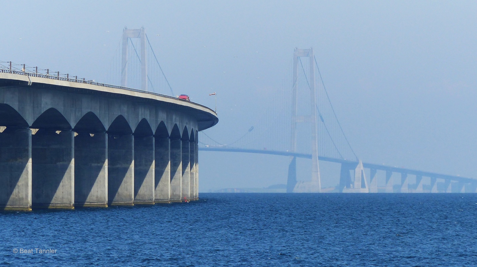 Nach dem Fotostopp und einer Erfrischung wagten wir uns über die gigantische „Storebæltsbroen“ (Großer-Belt-Brücke) auf die Insel Fyn. Die Strasse führt über die erste Brücke auf die Insel Sprogø und in grossem Bogen weiter über die Hängebrücke rechts.