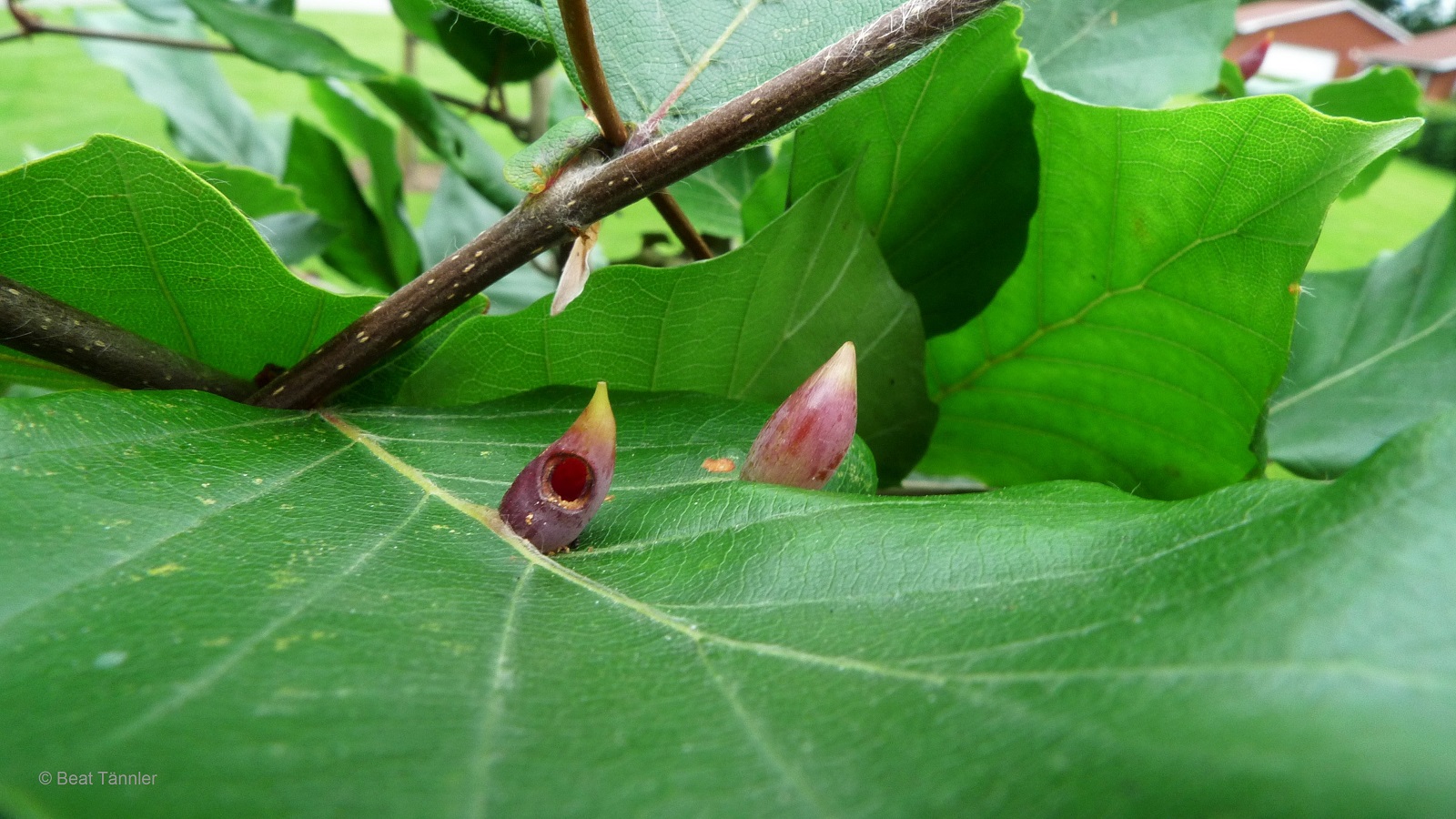 In der Nähe fallen uns an einer Buchenhecke diese „Püggel“ auf den Blättern auf.