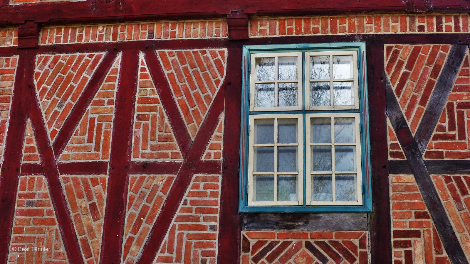 Der Riegelbau wurde liebevoll mit Klinkern ausgefacht, die sauber in verschiedenen Richtungen eingemauert wurden. Selbst ein unterschlächtiges Mühlrad, das sich im Wasser dreht, wurde kunstvoll mit Backsteinen in der Hausmauer abgebildet.