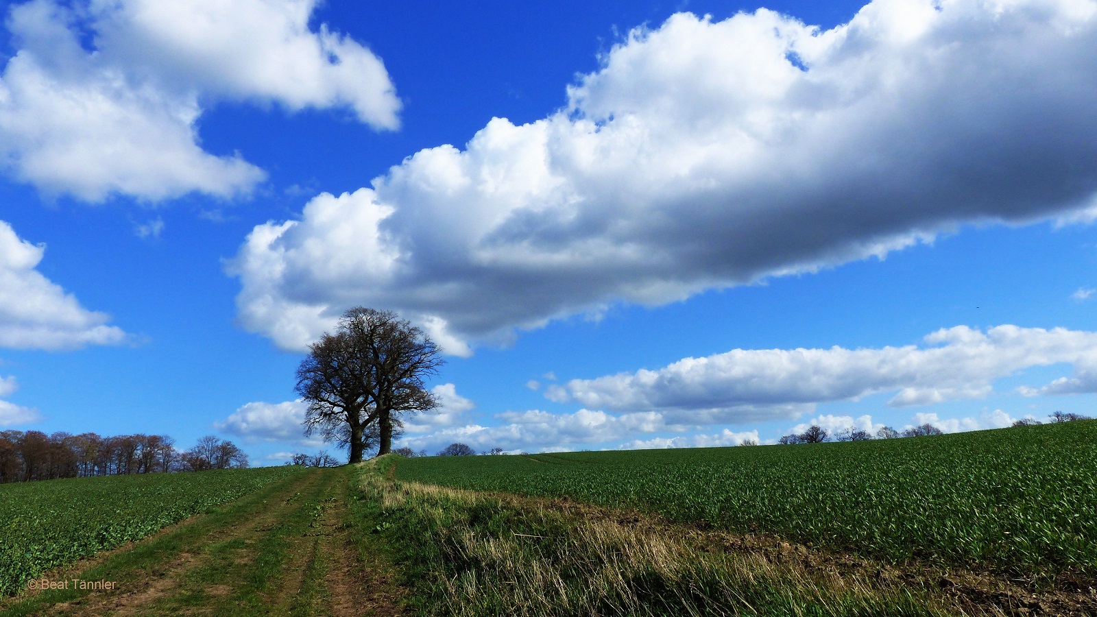 Nun verlassen wir die urbane Gegend und wandern auf einem Feldweg zwischen Rapsfeldern. Bei zwei grossen Eichen legen wir eine kleine Pause ein.
