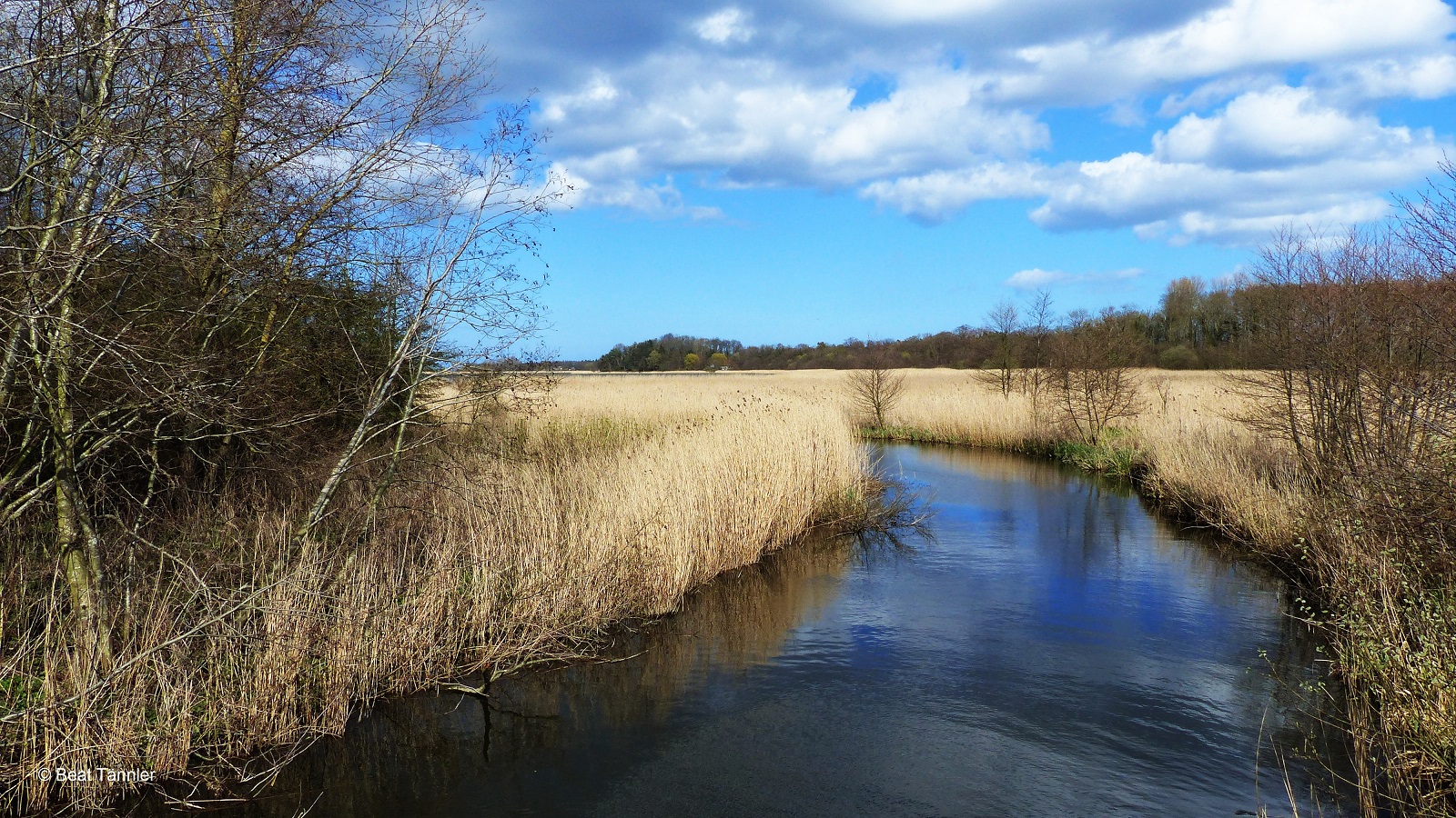 Nun überqueren wir die Kossau, die sich durch das Schilf oder Reet, wie man hier sagt, schlängelt.