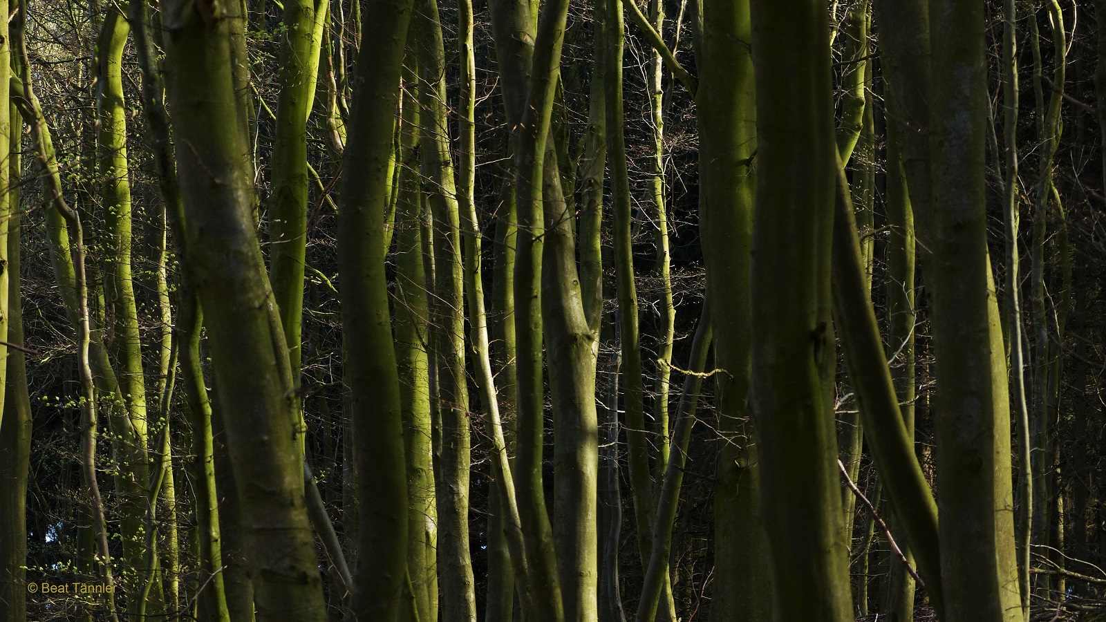 Die Abendsonne lässt in dem laublosen Buchenwald die gelb-grünen Flechten oder Moose (weiss jemand, was es ist), die die Stämme überziehen, leuchten.