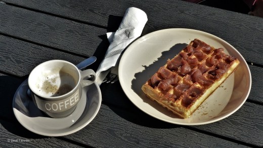 Am Lac du Lampy geniessen wir im Restaurant die Frühlingssonne und Waffeln mit Maronen-Crème.