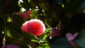 Im Garten des Nachbarn leuchten einzelne Kamelienblüten im Gegenlicht aus dem schattigen Busch.