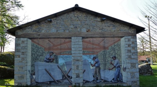 Nun fahren wir durch Saint Salvy de la Balme und sehen durch zwei offenen Tore in ein Haus, in dem Männer Steinplatten behauen.