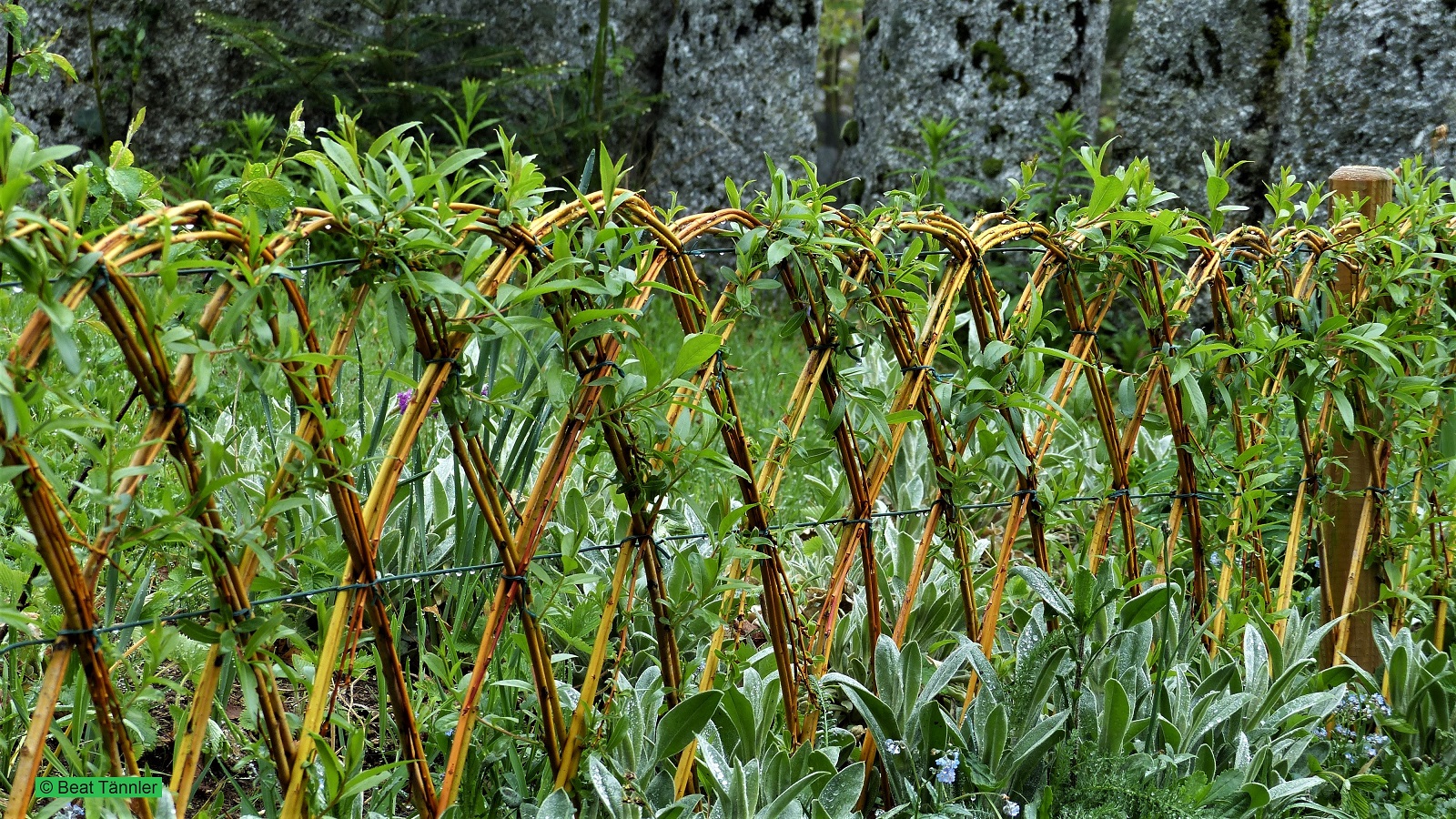Aber ein zarter Zaun aus gesteckten Weidenruten, die nun austreiben, veranlasst uns zu einem ersten Stopp.