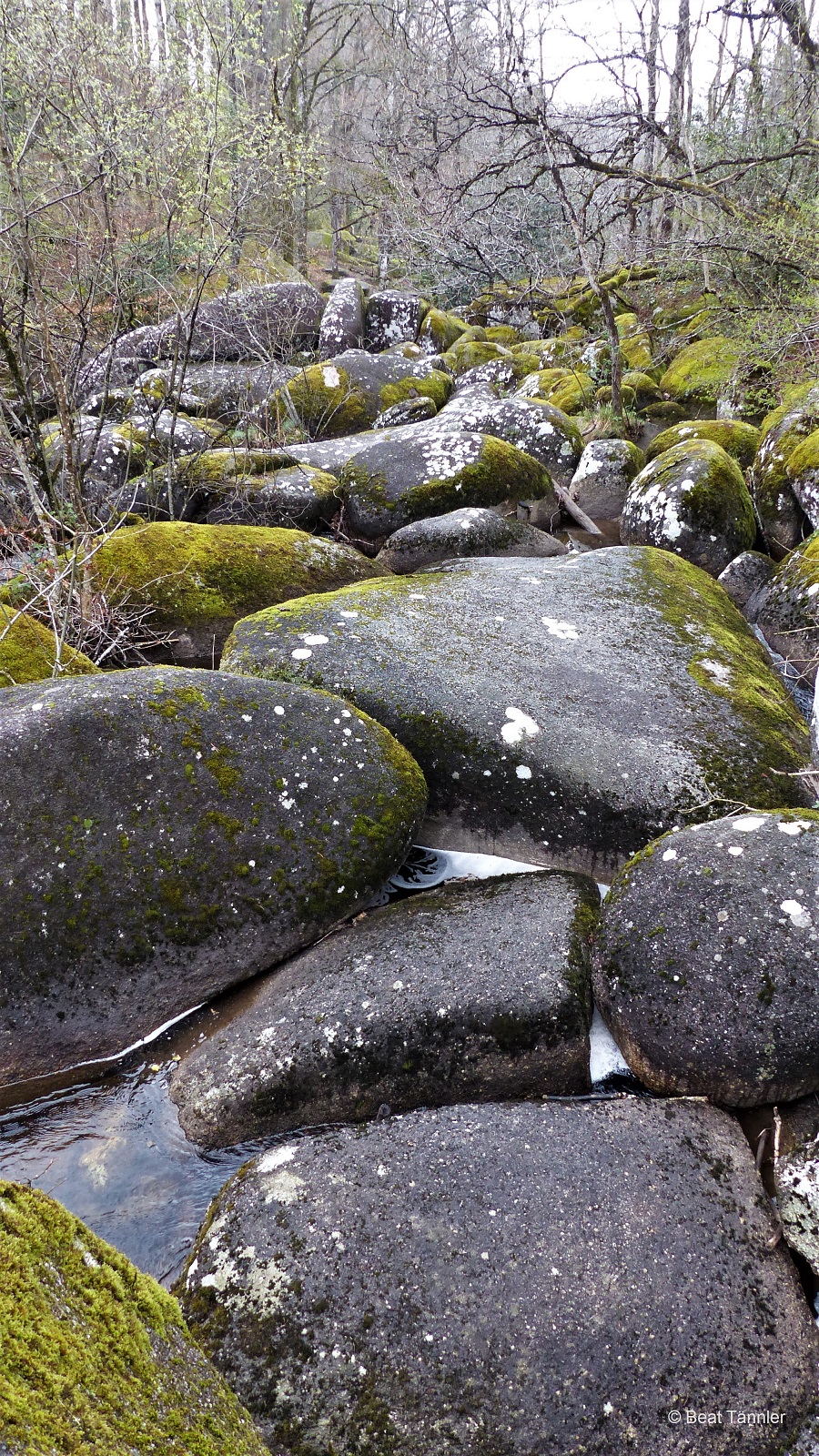 Dann geht es weiter zum „Felsenbach“. Ein unscheinbarer Bach fliesst zwischen einem Band aus mächtigen Felsen, das sich wie ein Wasserlauf durch den Wald schlängelt.
