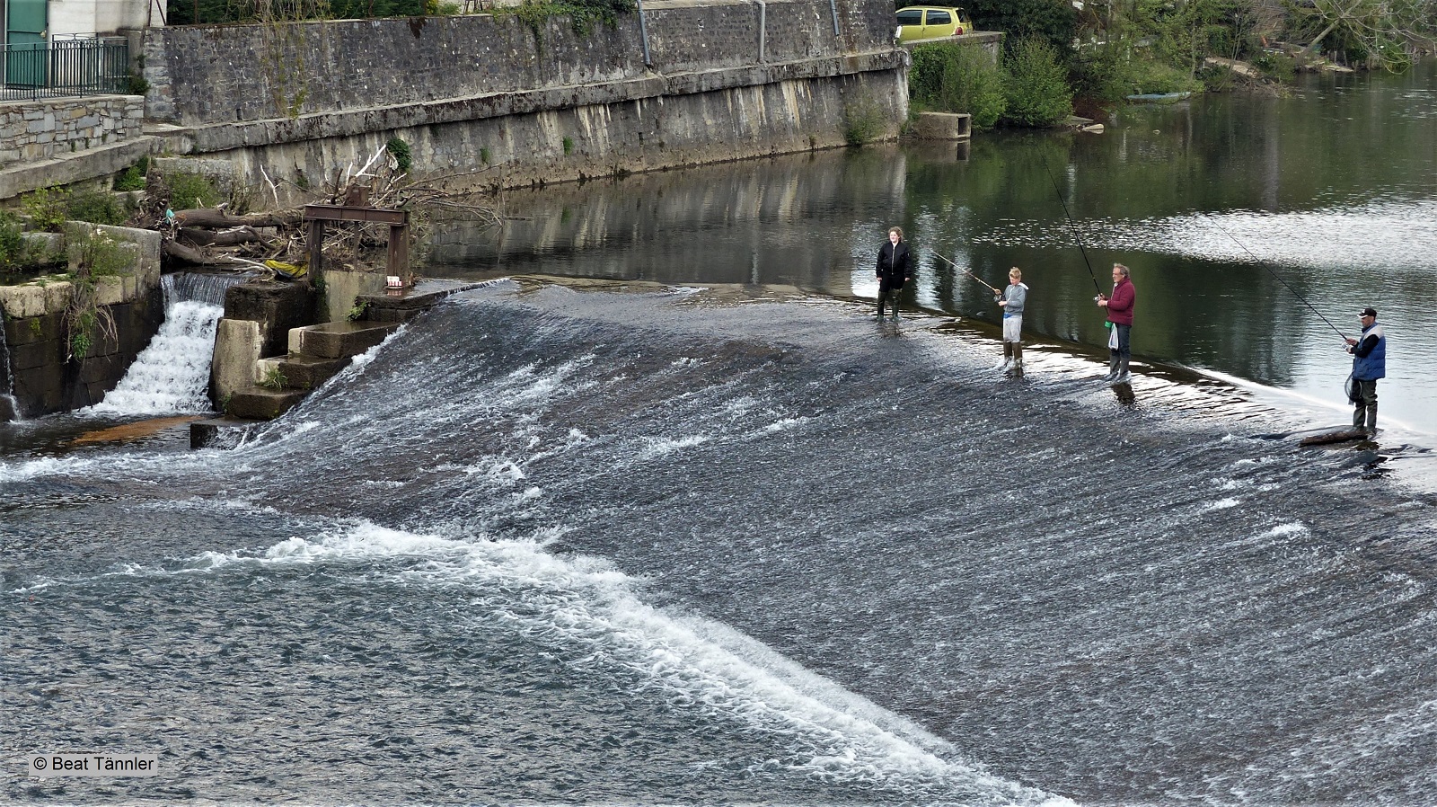 Da wir aber gerade über Fische und Futter geschrieben haben, stoppen wir trotzdem in Roquecourbe und schiessen ein Bild von den Anglern am Wehr.