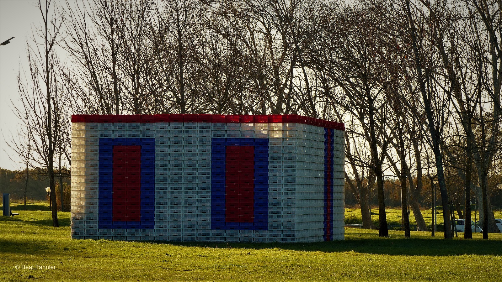 Eines der Kunstwerke, die hier aufgestellt sind, sticht besonders ins Auge. Das „Casa no Céu“ der Künstlerin Xana. Das Haus hat sie aus industriell gefertigten Plastikharassen gebaut.