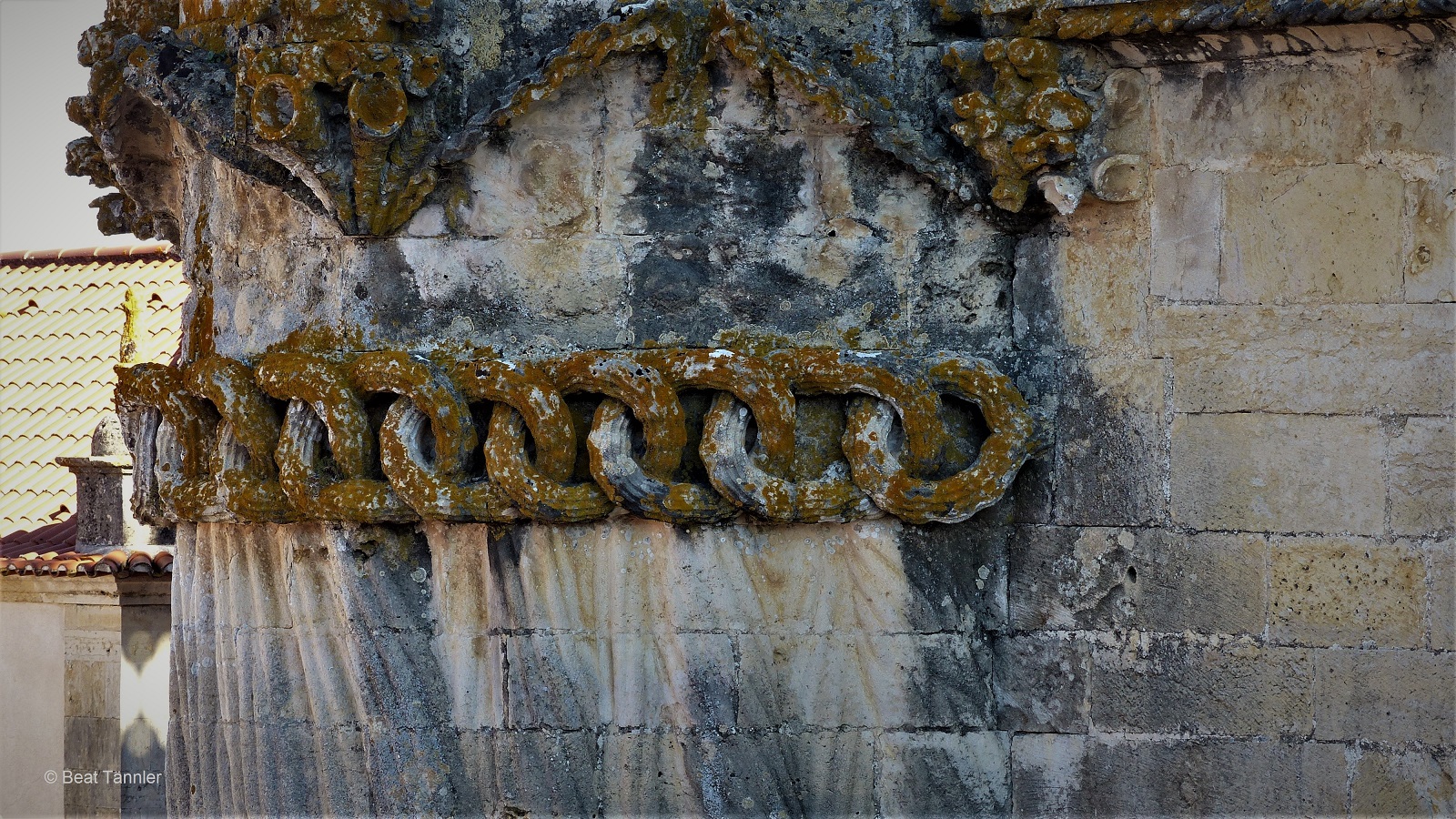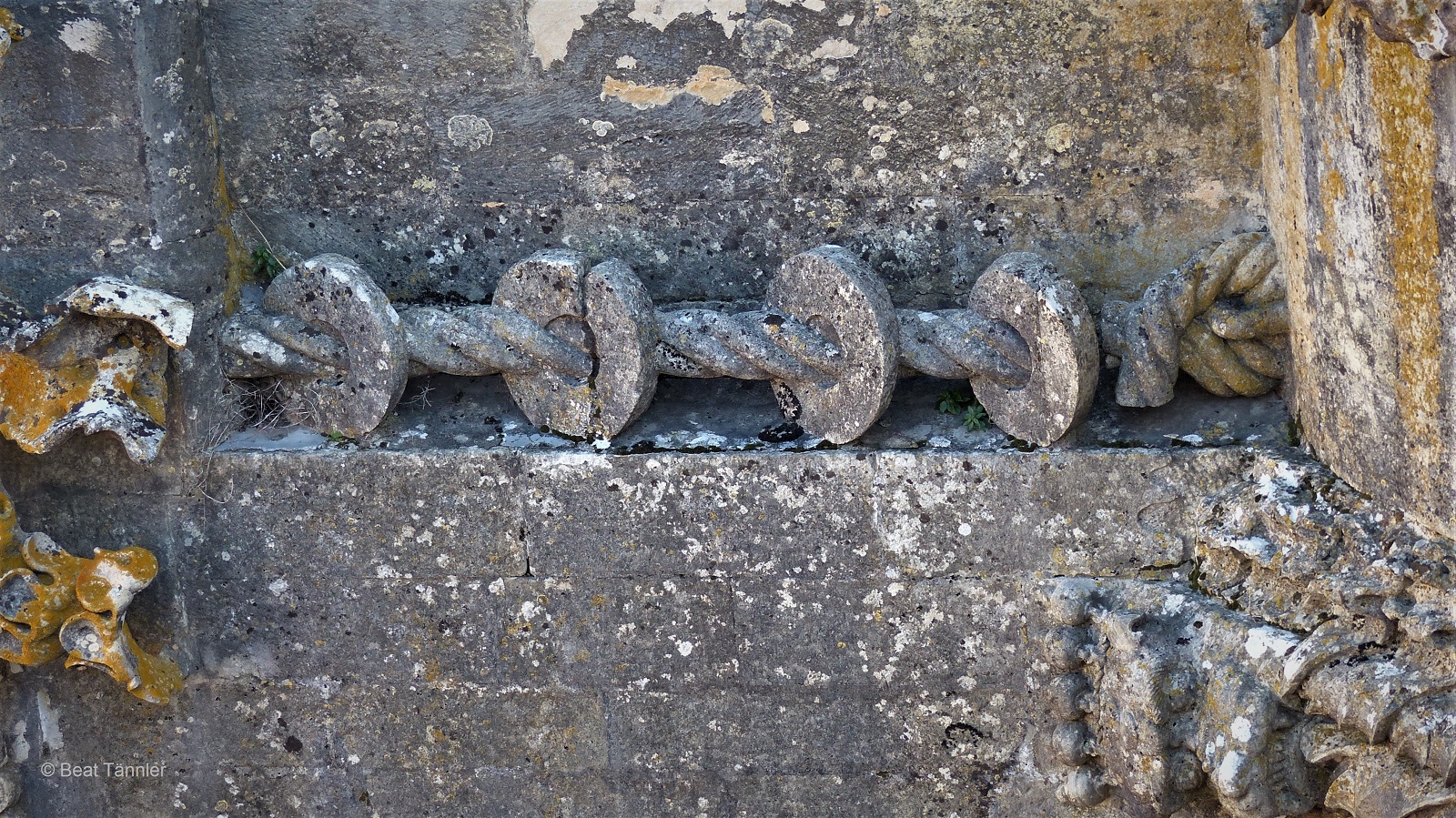 Folgende Details suggerieren, dass die Mauern und Säulen mit Gürteln, Schnüren, Ketten oder Geflechten zusammengehalten werden.