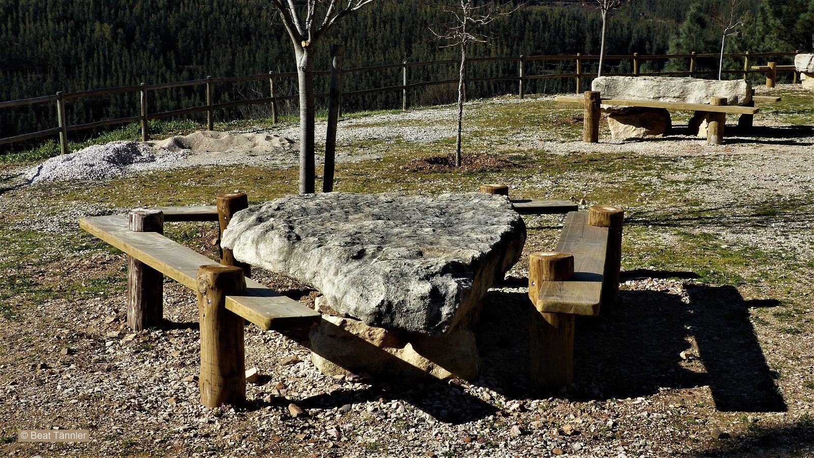 Die Tische am Picknickplatz sind auf Steinen gelagerte, roh behauene Felsplatten. Die Bänke sind von einer Art, wie wir sie noch nie gesehen haben. Die Holzbretter sind in Rundhölzer eingelassen und verschraubt.