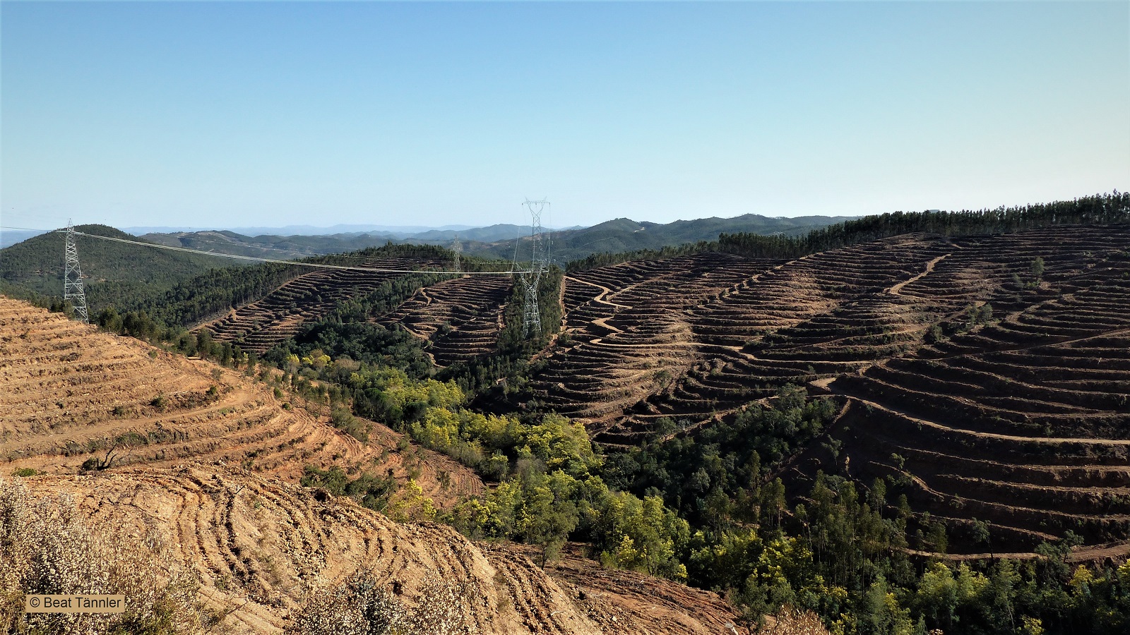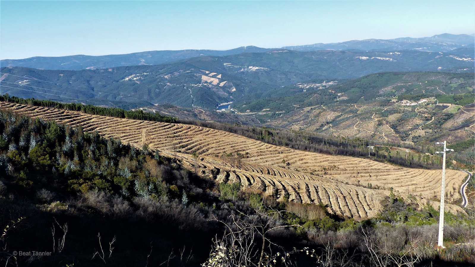 Eine schmale unbefestigte Strasse führt durch den Wald hinauf zum Miradouro von Venda Nova. Dort gibt es sogar eine dreieckige Plattform. Wozu die gebaut wurde, können wir uns nicht vorstellen, da die Picknickplätze wenige Meter davon entfernt liegen.