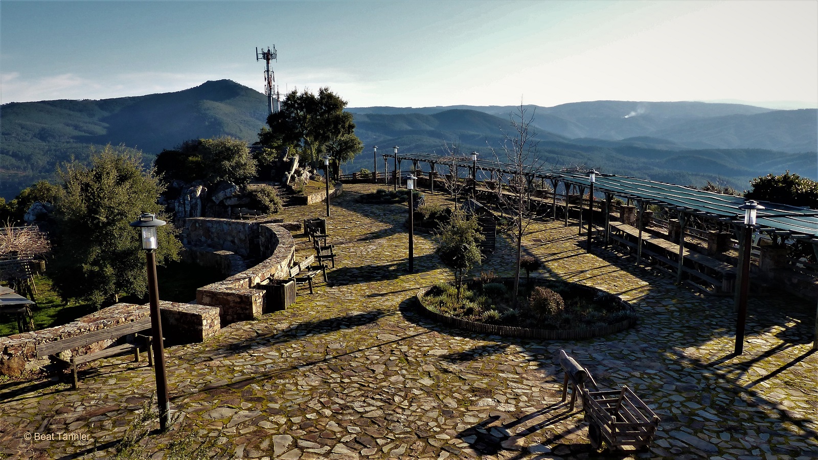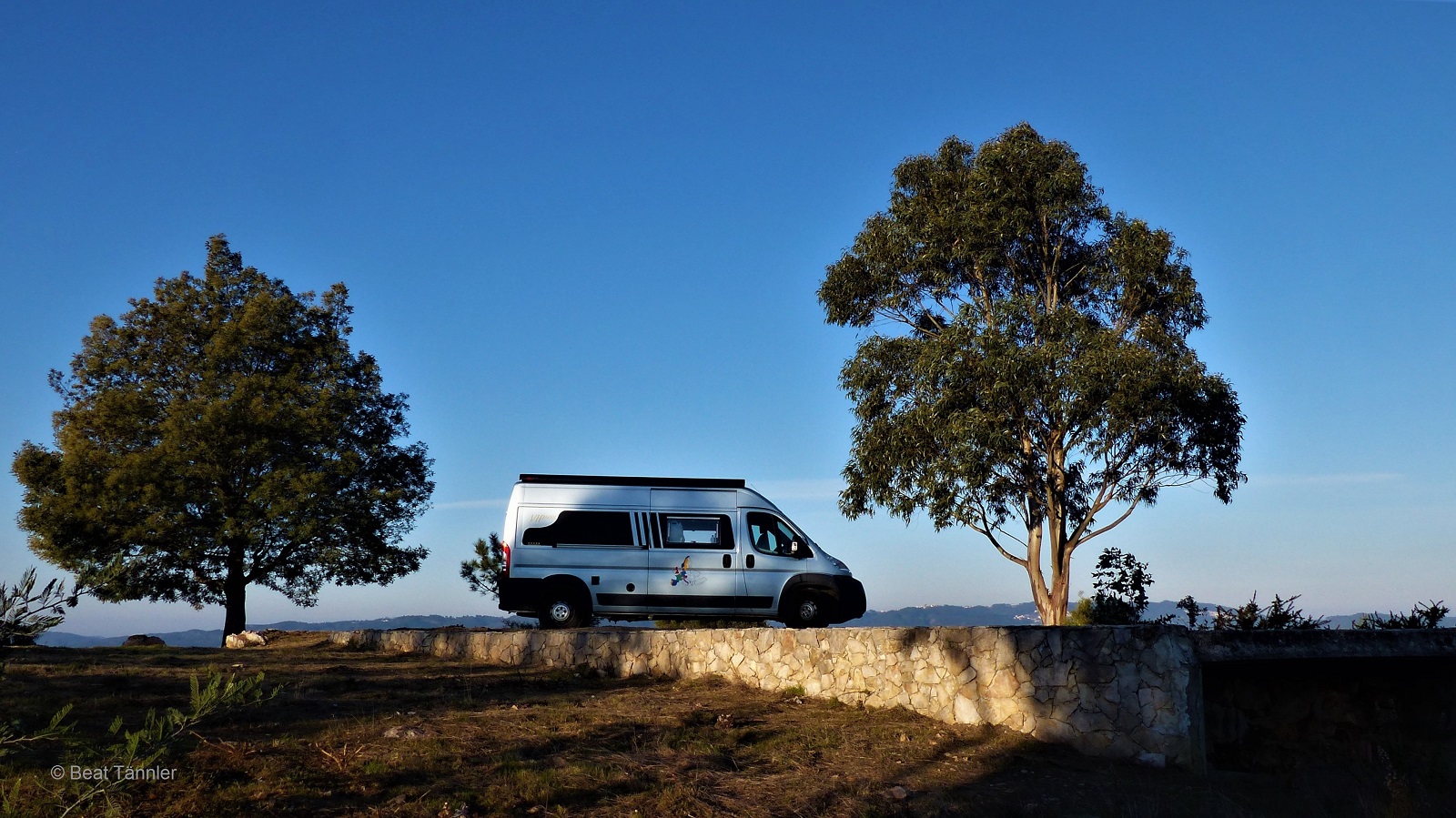 Am Nachmittag finden wir etwas oberhalb von Orvalho einen sagenhaften Übernachtungsplatz. Wir fahren eine schmale Strasse hoch. Auf dem Hügel thront ein wunderschön ausgebauter Picknickplatz mit eigenem kleinen Aussichtsturm. Die Parkplätze sind zwar nur für Pkw gedacht, aber jetzt im Januar ist noch nichts los und wir können unseren NOBIS für die Nacht quer über die Markierungen stellen. Einmal mehr sind wir froh, dass unser Gefährt nur sechs Meter lang und nicht überbreit ist.