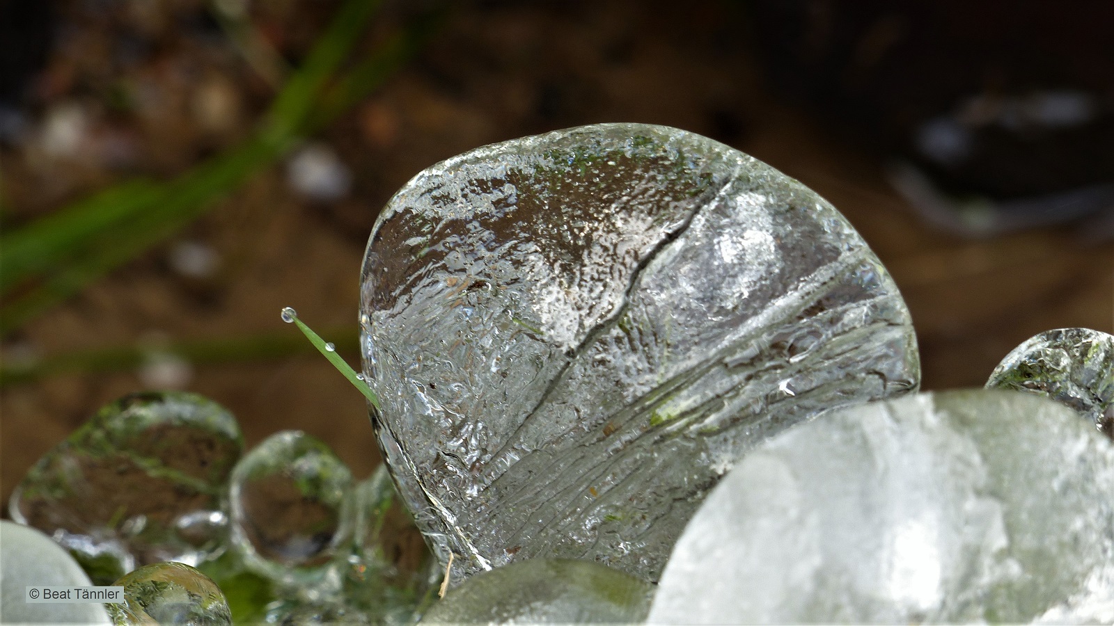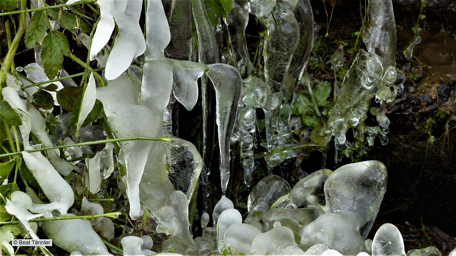 Ein Bächlein im Schatten einer Mauer ummantelt die Gräser mit einer Eisschicht und erschafft so frostige Skulpturen.