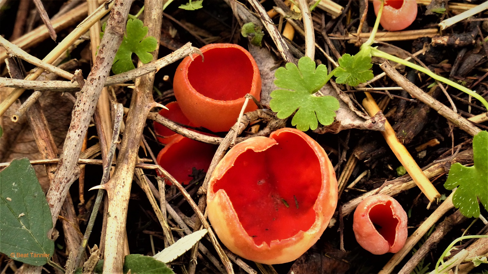 Kurz darauf finden wir eigenartige rote Pilze mit becherförmigen Fruchtkörpern.
