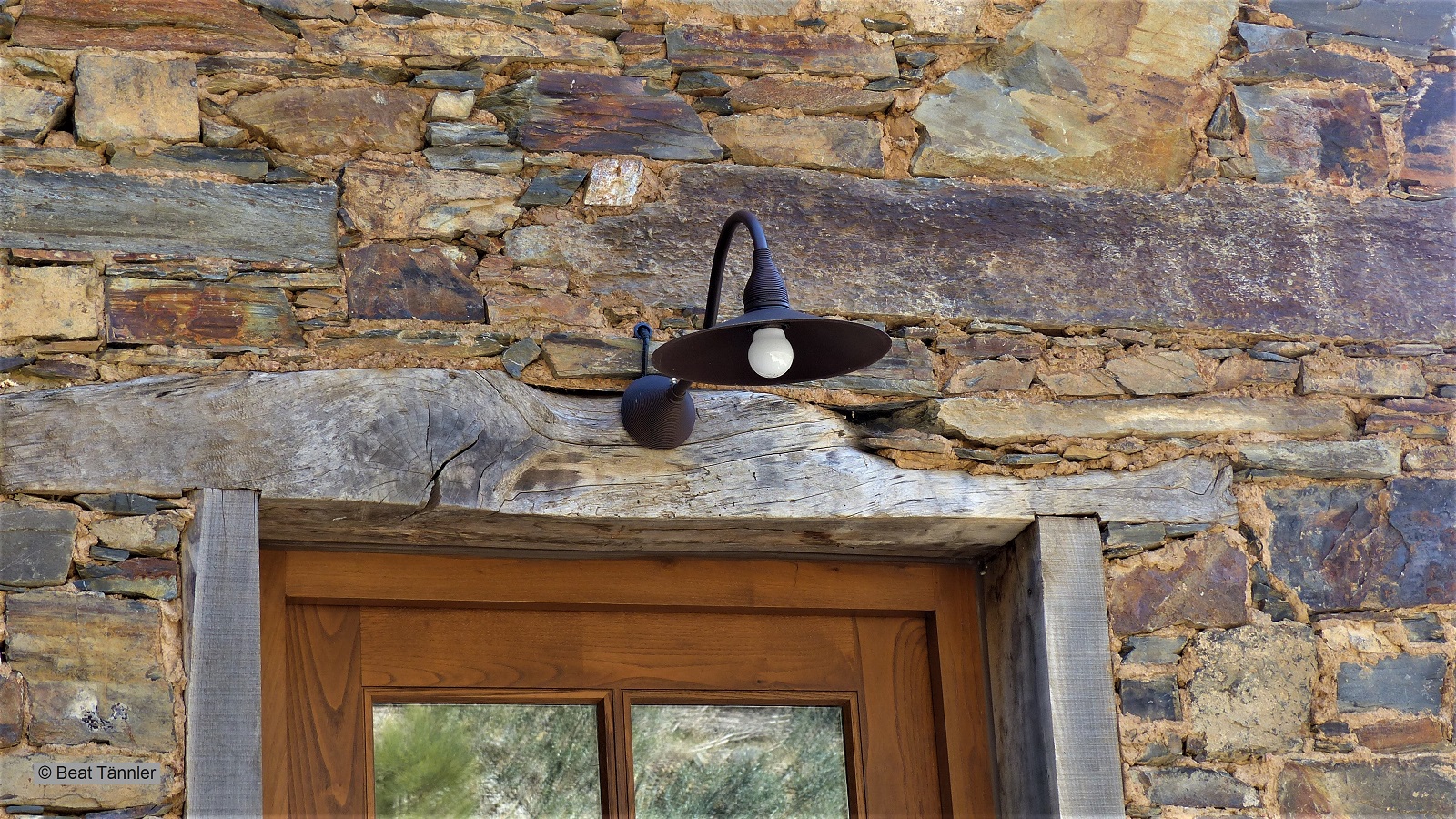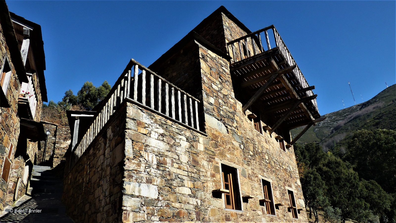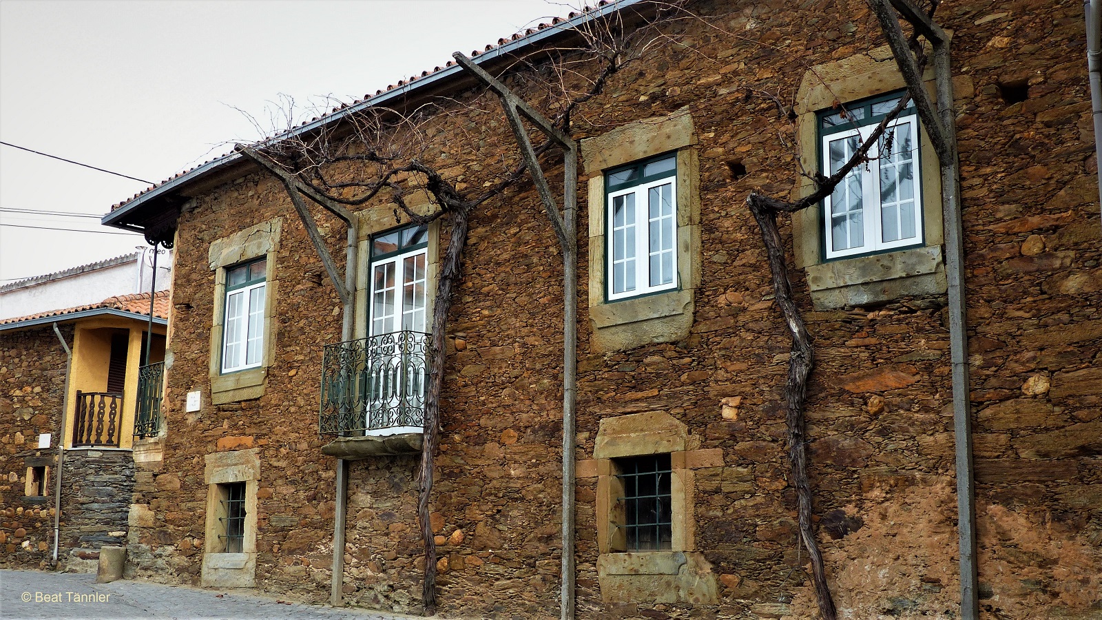 Deshalb verkürzen wir unsere Rundreise. Ein Wegweiser lockt uns in das „Schieferdorf“ Janeiro de Baixo. Im Dorf stehen noch einige Häuser, die aus Schiefersteinen gebaut wurden. Zwischen den Schieferplatten wurden auch geschliffene Steine aus dem nahen Bach vermauert. Die waren wohl einfacher zu handhaben als der Schiefer, der erst noch zurecht gehauen werden musste.