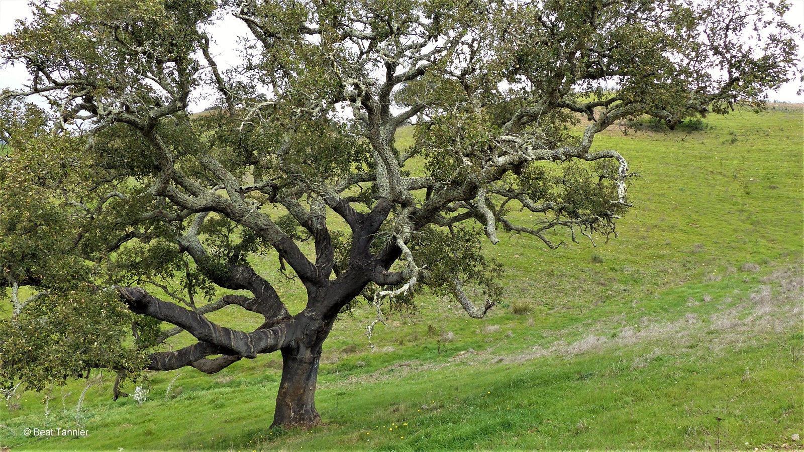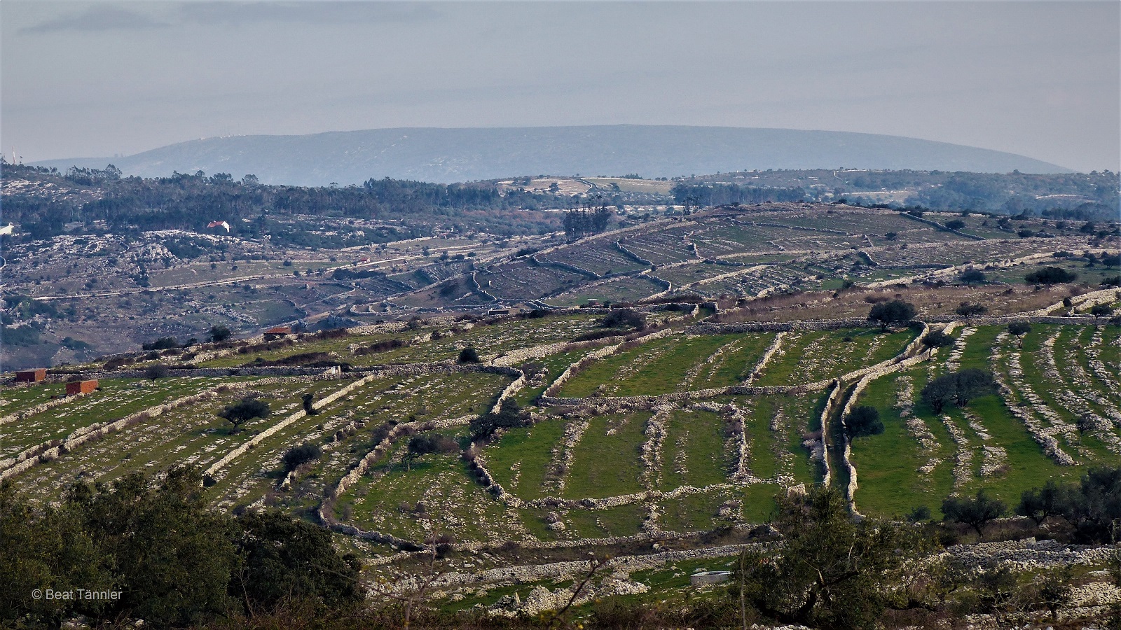 Ein mit Mandelbäumen bepflanzter Hügel fällt uns auf. Hier ist der Boden mit blühenden Pflanzen bewachsen und liegt nicht nackt da, wie sonst üblich. Ob es sich da um eine Bio-Plantage handelt, wo die „Unkräuter“ nicht totgespritzt werden?