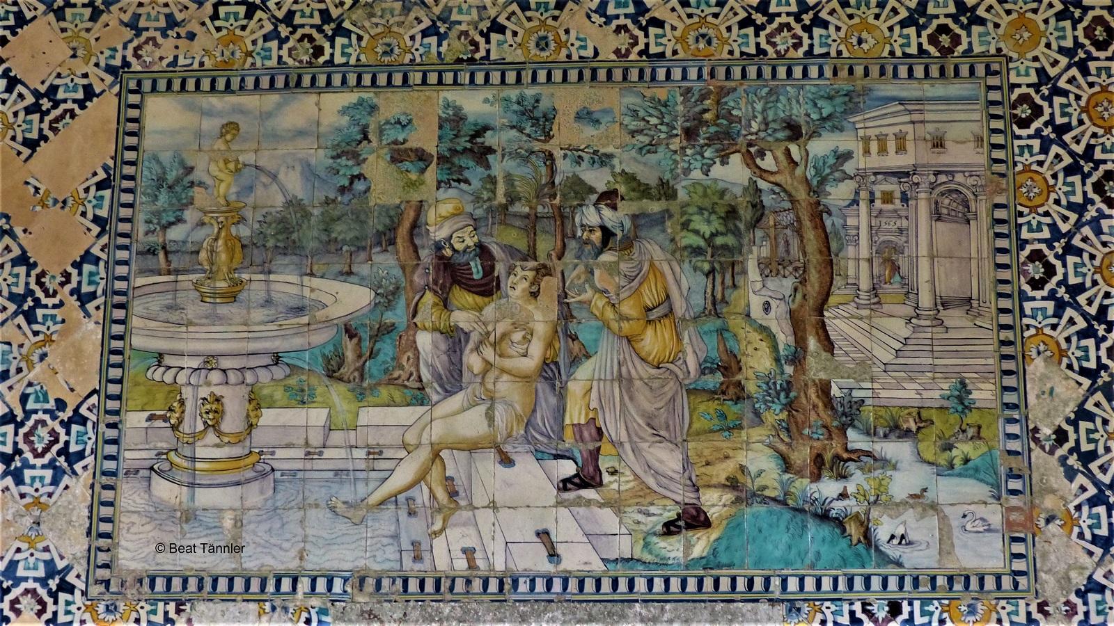 Wir verlassen das Kloster durch einen schmucken Bogengang, von dessen Decke herab uns Mönche anschauen und in ihr Gebet einzuschliessen scheinen.